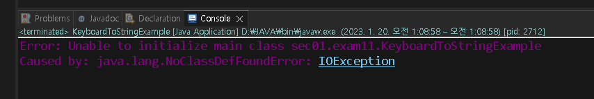 여기서는 throw IOException을 사용해서 예외처리를 해줘야하는데 밑의 그림을 보면 오류가 나는 것을 볼 수 있다.