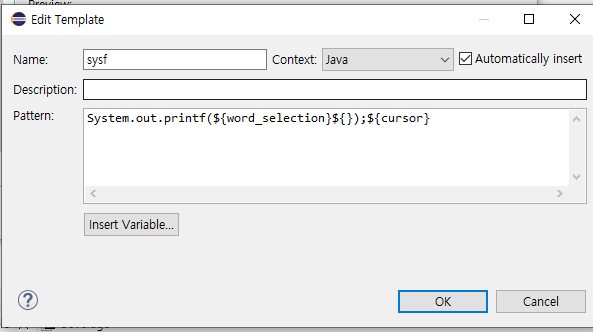 만약에 system.out.pritnln외에도 설정하고 싶다면 아래와 같이 설정하고 바로 뜬다면 엔터누르면 되고, 안된다면 ctrl+space를 누르고 설정하면 된다.