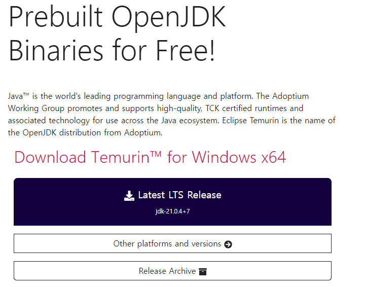 최신 JDK를 받을 수 있다. Latest LTS Release를 다운로드하여준다. 다운로드하여 준 후